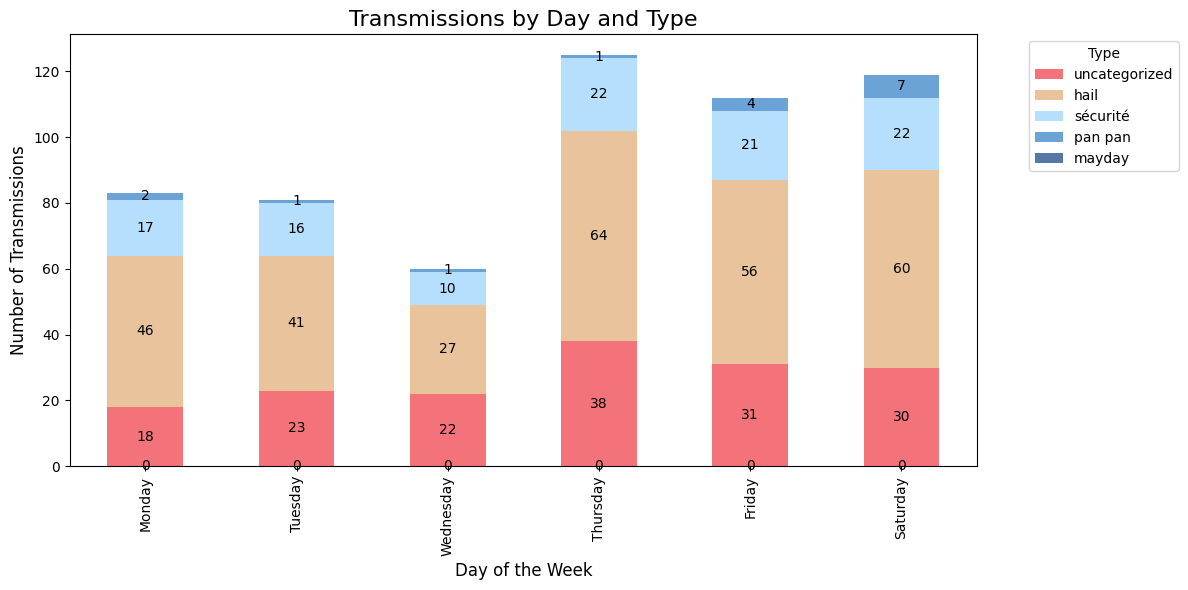 Maritime VHF traffic surged 40% this week to 550 messages versus 392 last week. Pan Pan alerts jumped from 10 to 41 while routine "hail" calls nearly doubled and uncategorized messages climbed. These shifts point to heavier operational traffic on Thursdays and Saturdays.