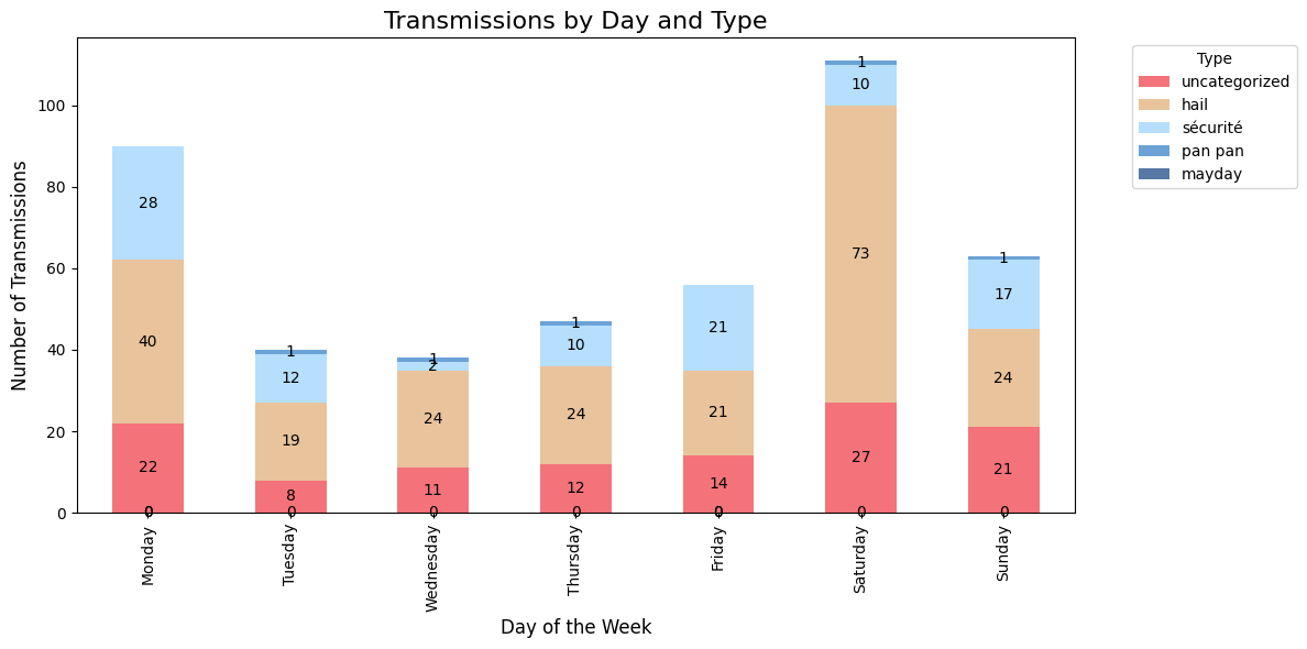 Big swing on VHF this week: total transmissions fell to 402 from 607 last week. Hail calls still dominate but dropped from 294 to 225, "pan pan" alerts plunged to 5 while safety communications stayed near 100.